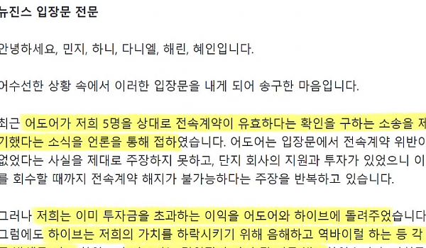 오늘 나온 뉴진스의 입장문.jpg