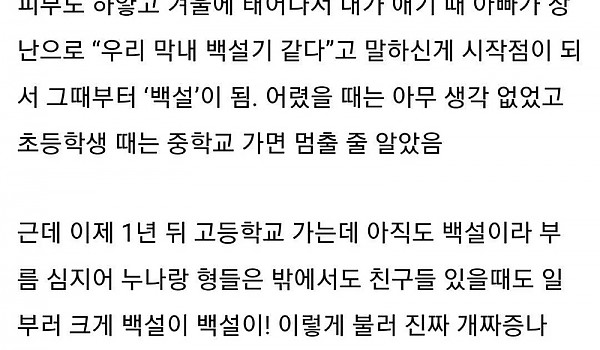 16살인데 늦둥이라고 아직도 ‘백설’이라 불러서 짜증나