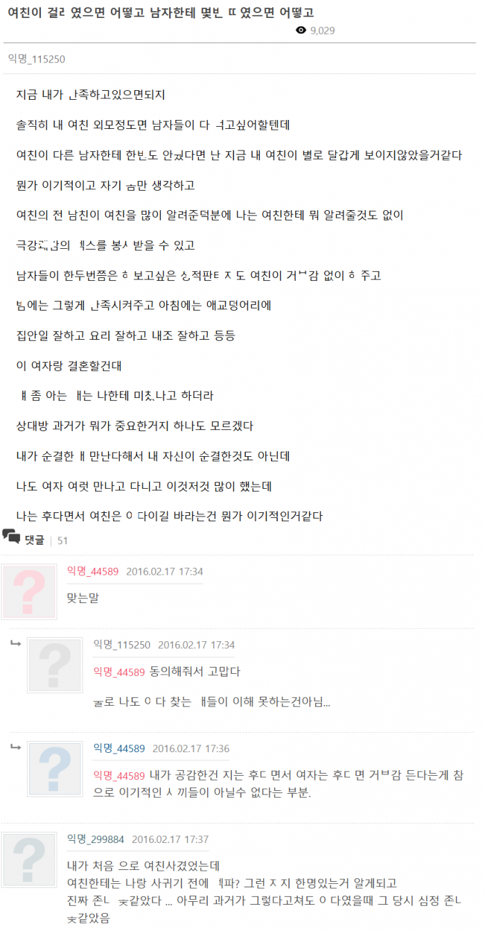 여친이 걸ㄹ였으면 어떻고 남ㅈ..r한테 몇번 ㄸ였으면 어떻고