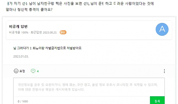 유ㅊㅇ 선ㅅ의 ㄱㅅ이 너무 커서 화난 유ㅂ녀