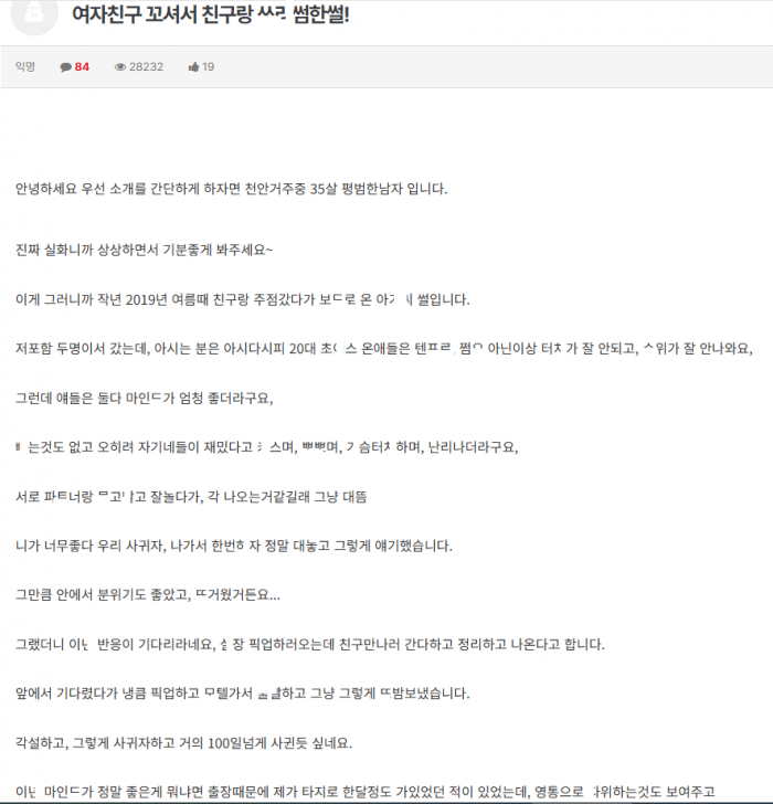업ㅅ녀 여친 사귀고 여친 ㄲ셔서 친구랑 ㅆㄹ썸한 썰