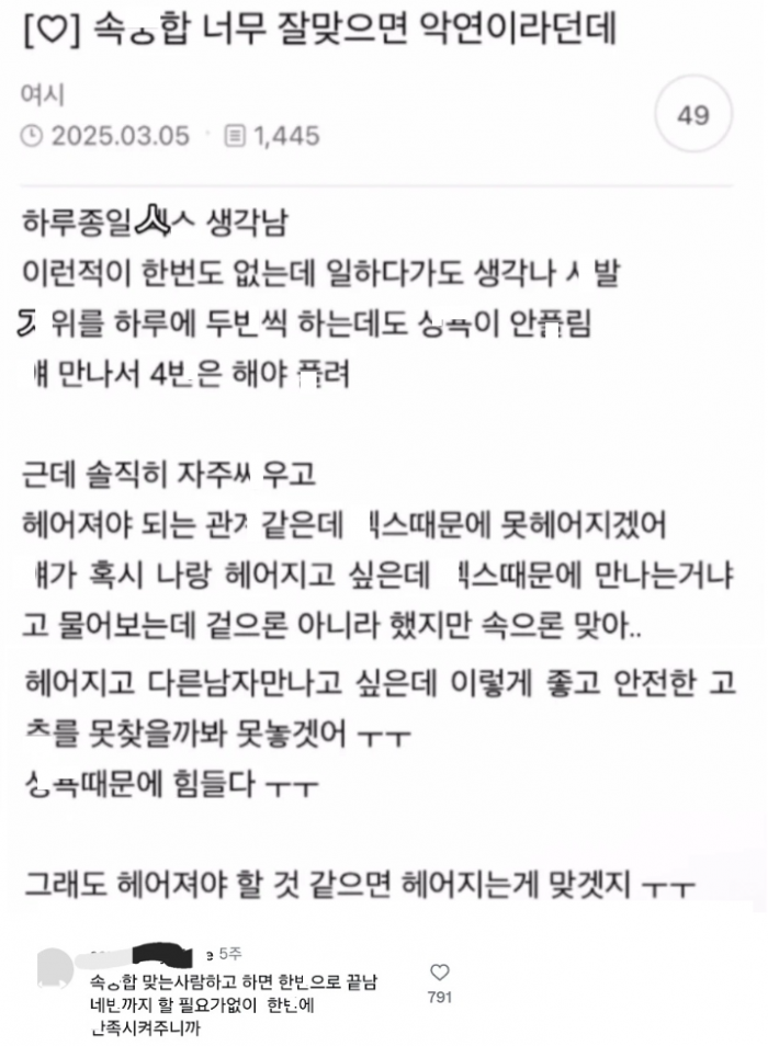 ㅅㅅ할때 ㅅ궁ㅎ이 너무 잘맞아서 못 헤어지겠음