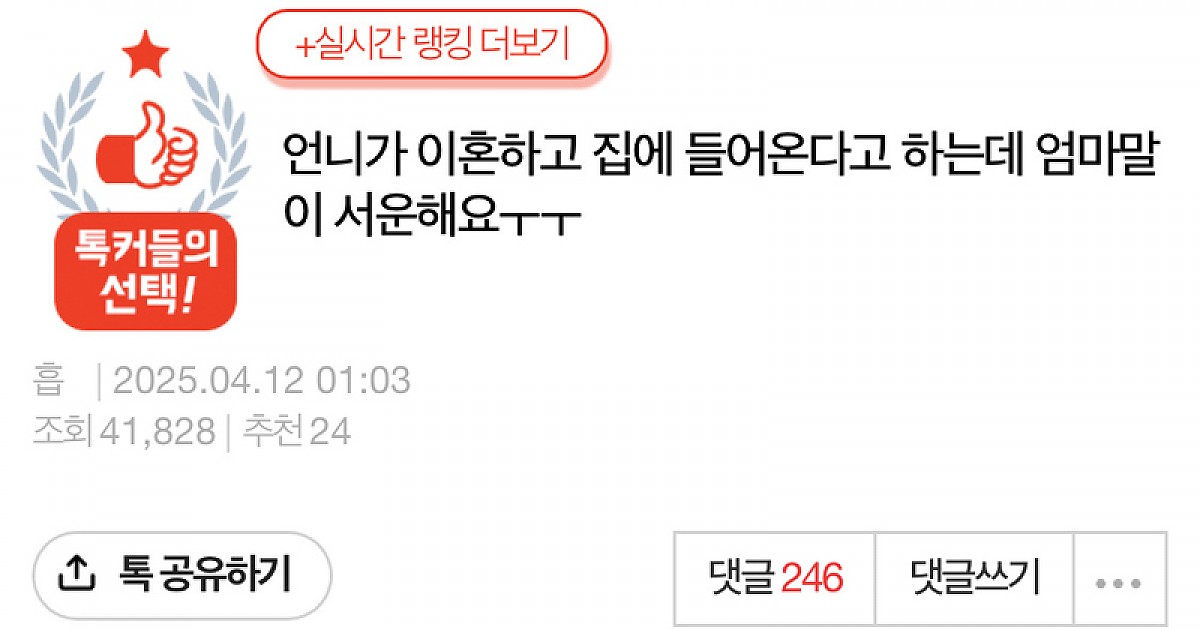 언니가 이혼하고 집에 들어온다고 하는데 엄마말이 서운해요ㅜㅜ