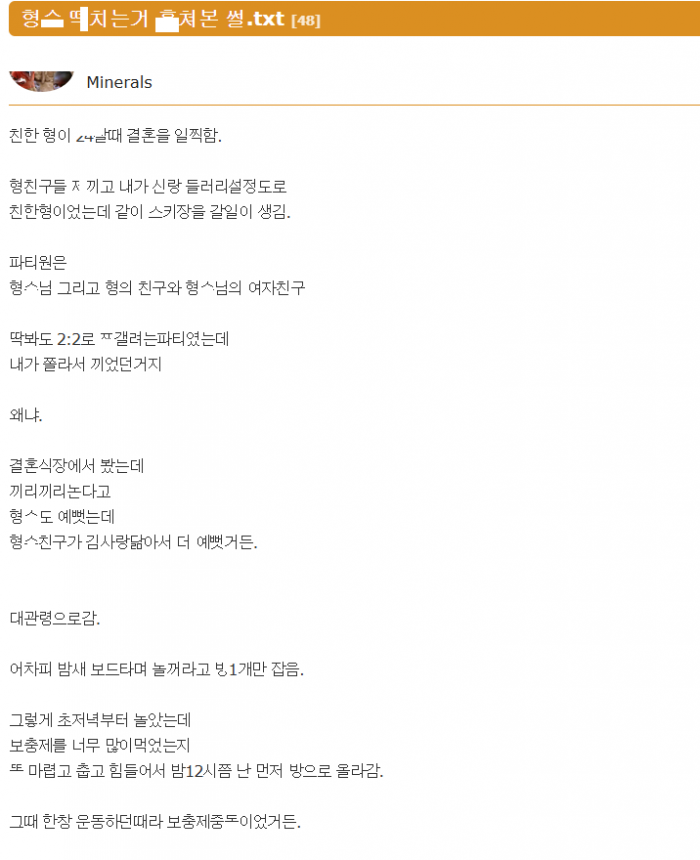 스키장 놀러갔다가 아는형이랑 형슈가 ㄸ치는거 몰ㄹ 훔ㅊ본 썰