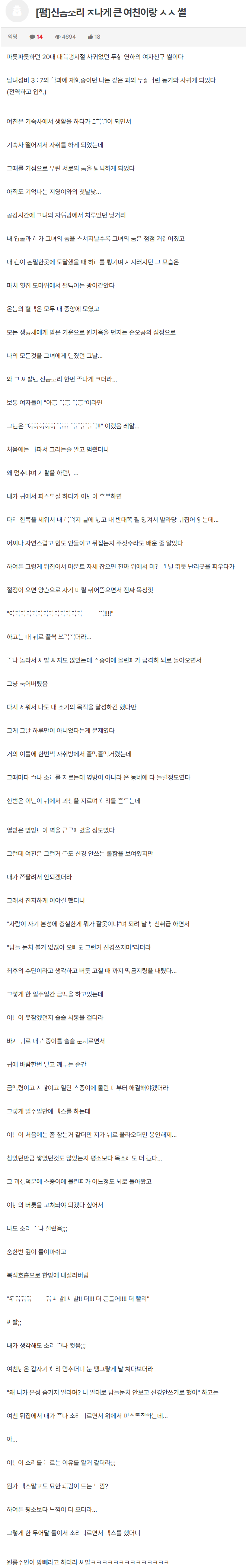 신ㅇ소ㄹ ㅈㄴ 컸던 여친 ㅂㅈ ㅆ신 썰