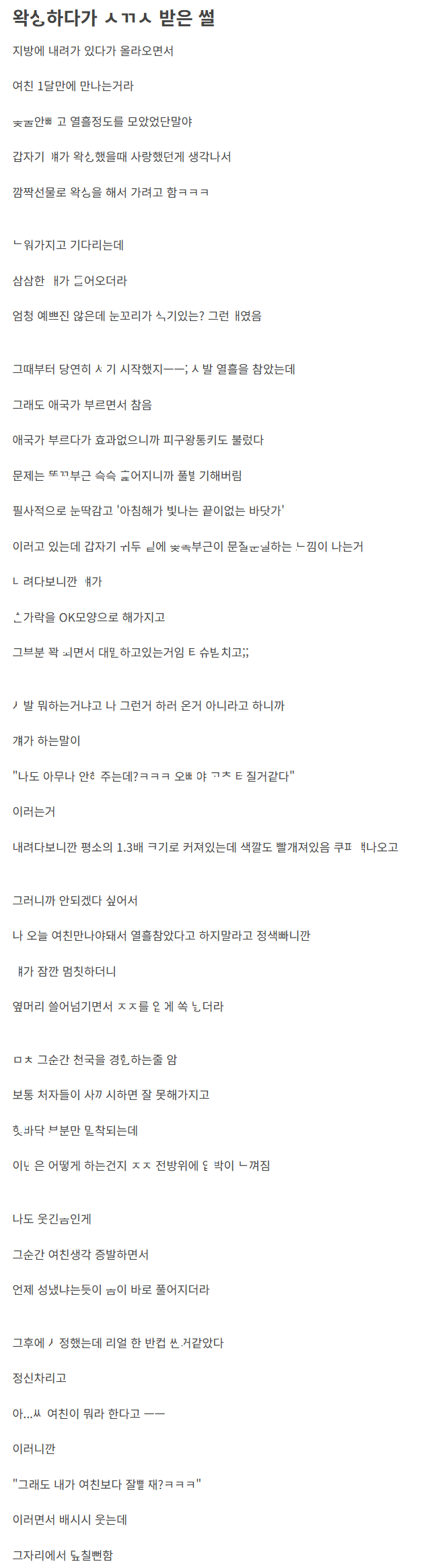 여친한테 서프라이즈 하려고 왁ㅅ하러 갔다가 왃서한테 사ㄲㅅ 받은 이야기