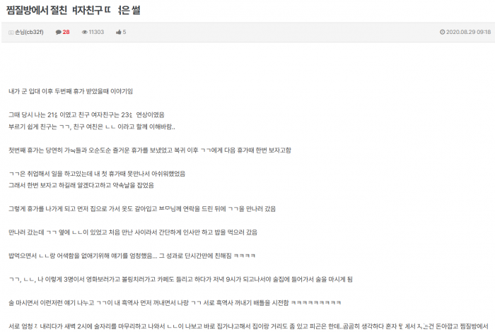 여친이랑 여친 절친이랑 셋이 찜질방 갔다가 여친 몰ㄹ 절친 ㄸㅁ은 이야기